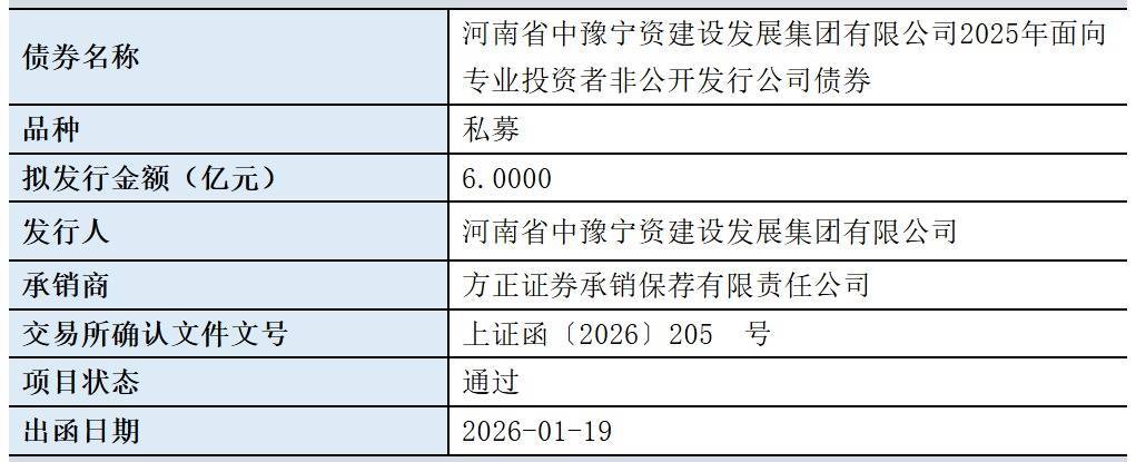 【大河财立方消息】1月20日消息,河南省中豫宁资建设发展集团有限公司2025年面向专业投资者非公开发行公司债券项目获上交所通过。本期债券拟发行金额6亿元,承销商为方正证券承销保荐有限责任公司。