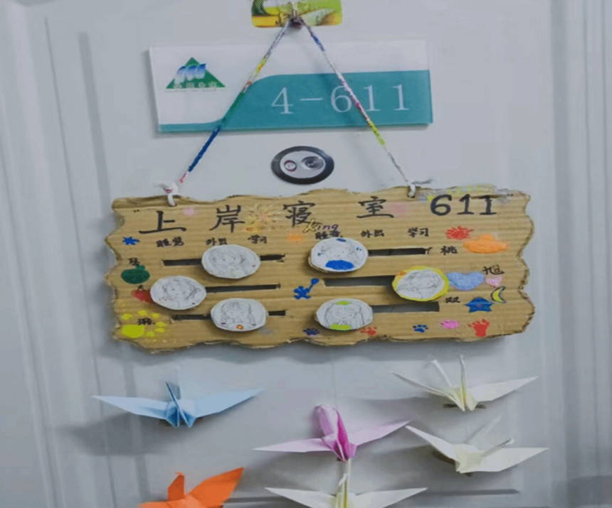 五湖四海,汇聚一方。当她们6人被热情的师兄师姐们领到4栋611的门口时,这间宿舍注定将要成为她们未来大学4年生活的温暖港湾。大二那年的寝室文化节,是青春里一场隐秘的“开工仪式”。彼时,大家把未来的野心,都藏进了亲手绘制的门牌与千纸鹤里。她们把“上岸寝室611”写在最显眼的地方,画下6张小小的头像,把睡觉、学习、外出的状态做成可以滑动的小牌。那时的她们,带着点稚气的认真,约定好一起在4-611寝室的灯光下熬过漫漫长夜,互相监督、彼此鼓励。千纸鹤承载着我们的心愿,从2023年的冬天开始,就陪着她们一步步走向属于6个人的未来。