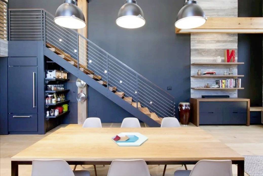 楼梯下方的空间至少超过1平方米,若闲置便显得太浪费了。考虑在这个空间里进行墙面收纳设计,充分利用家中每一寸空间!