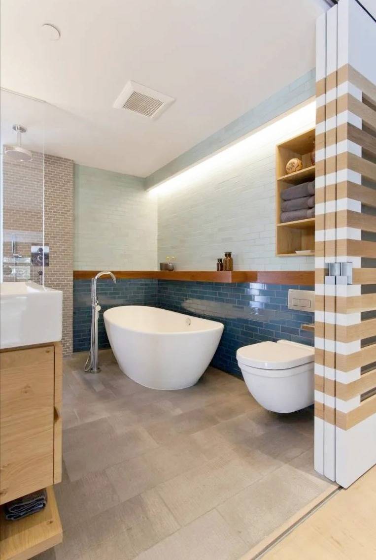 打开卫生间门,首先映入眼帘的是一款无管道挂墙式马桶,其简洁清新的设计令人耳目一新。瓷砖腰线处配有延伸置物架,便于从马桶到浴缸之间的空间里,轻松收纳各种小物品。
