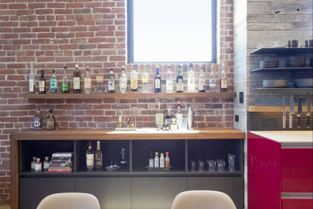 餐桌旁的餐边柜与橱柜紧密相连,无一丝缝隙,让强迫症患者也能放心。展示的酒瓶别具艺术感,给人以浓厚的文艺氛围。