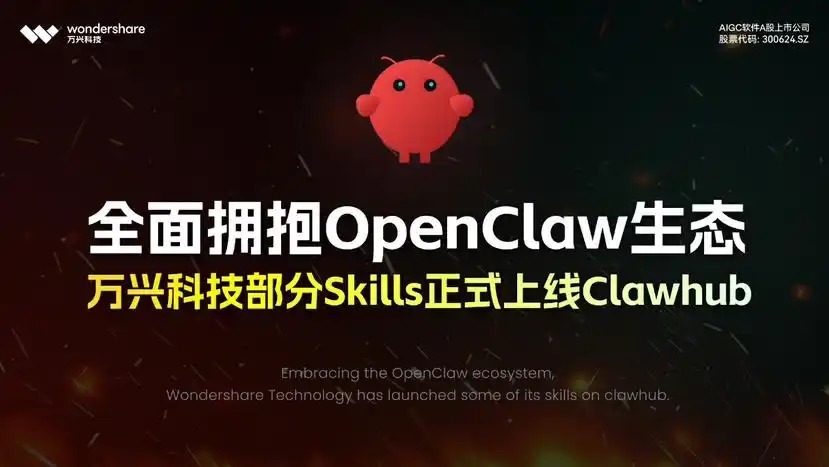 3月8日,AIGC软件A股上市公司万兴科技加码AI Agent布局,率先全面拥抱火爆全球的OpenClaw生态,对外宣布旗下面向开发者和企业用户的万兴天幕创作引擎近十项原子能力Skills已在海外OpenClaw市场平台ClawHub正式上线。用户登陆即可调用相关原子能力,一键解锁从创意到成品的全链路音视频创作,并可借此打造自身专属AI Agent。