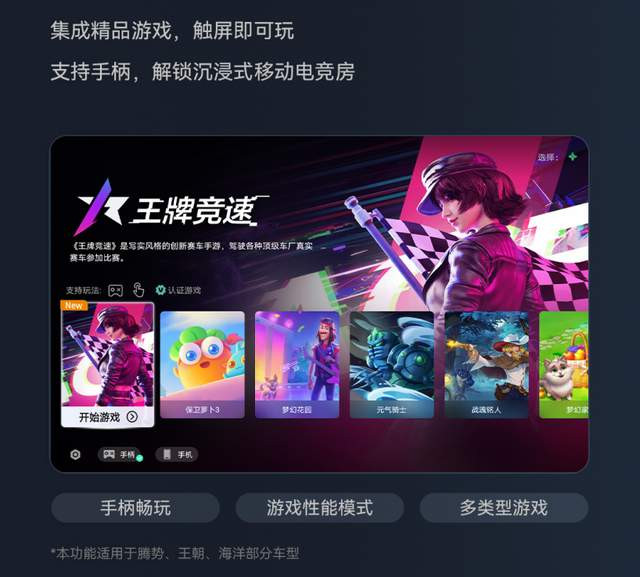 游戏中心为停车等待场景量身打造,内置《王牌竞速》《保卫萝卜 3》等精品游戏,支持触屏与手柄操作。开启 “性能模式” 后,DiLink 系统算力倾斜保障游戏流畅运行,让等待时光充满乐趣。