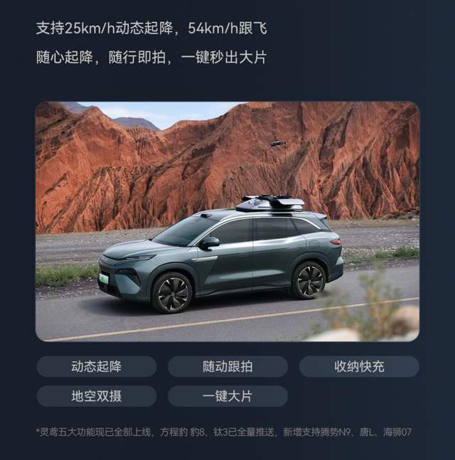 “灵鸢” 无人机动态起降功能展现跨界创新,车主通过车机系统完成无人机起降、航线规划与拍摄控制。越野时无人机可探路,露营时自动跟拍,车机屏幕实时显示画面并存储素材,实现 “一人一车一机” 的移动摄制组体验。