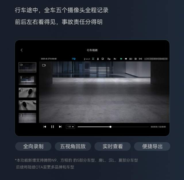 全向行车记录仪是安全领域的重要突破,提供主视角与前后左右环视五视角录制回放功能。变道时左右视角监控盲区,路口转弯记录两侧行人,事故后多角度视频为责任认定提供铁证,相比传统单视角记录仪,实现从被动记录到主动防护的转变,目前已覆盖腾势 N9、唐 L 等多款车型。