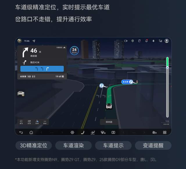 行车体验优化上,车道级导航解决了传统导航 “最后一公里” 的痛点。该功能融合高精地图、GNSS+IMU 融合定位技术及车端视觉感知,能在复杂路口实时渲染车道并动态提示最优路线。早高峰拥堵路段,系统可预判车道通行效率;临近高速岔口提前 500 米引导变道,大幅降低走错概率,配合 DiLink 5.0 系统算力,实现 “导航懂车更懂路” 的体验升级。