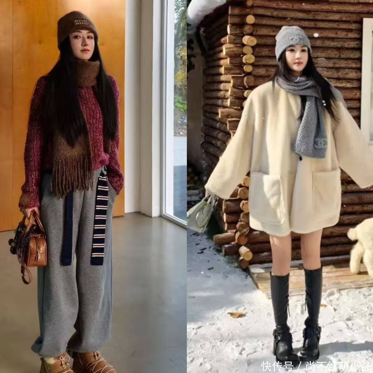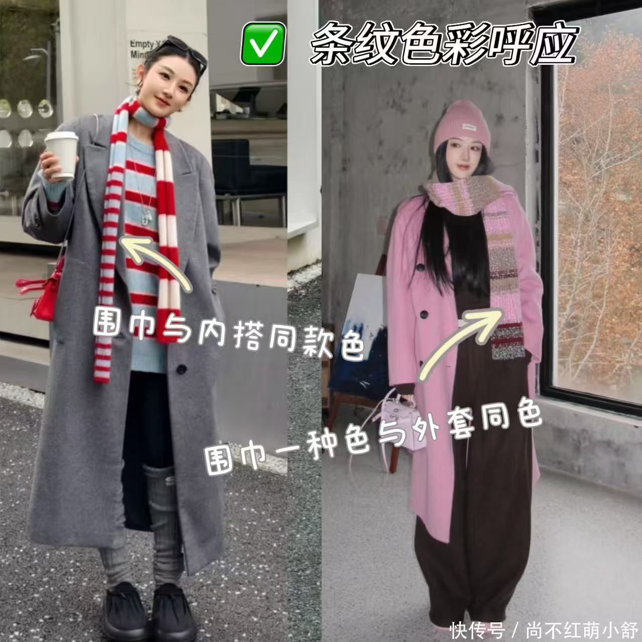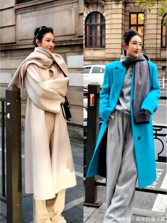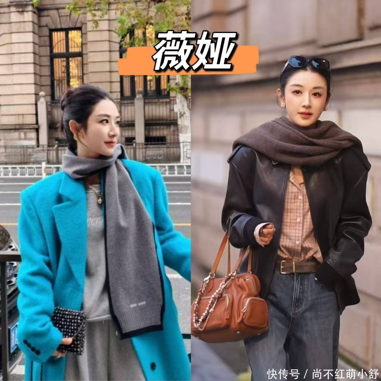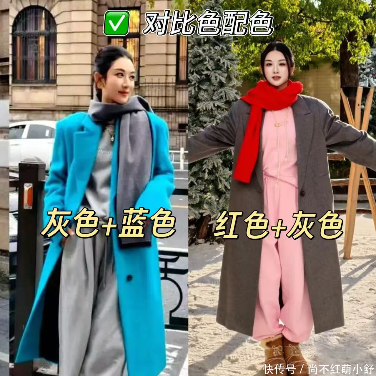 用深色围巾平衡亮色外套或者用亮色围巾点缀深色服装,瞬间提升整体造型的活力。比如薇娅左边这套用灰色围巾平衡亮蓝大衣的跳脱,同色系深浅过渡让整体层次分明;右边以正红围巾点亮灰粉组合,高饱和度色块碰撞出鲜活活力,既保留冬日穿搭的温暖质感,又通过色彩对比或呼应,让造型更吸睛。