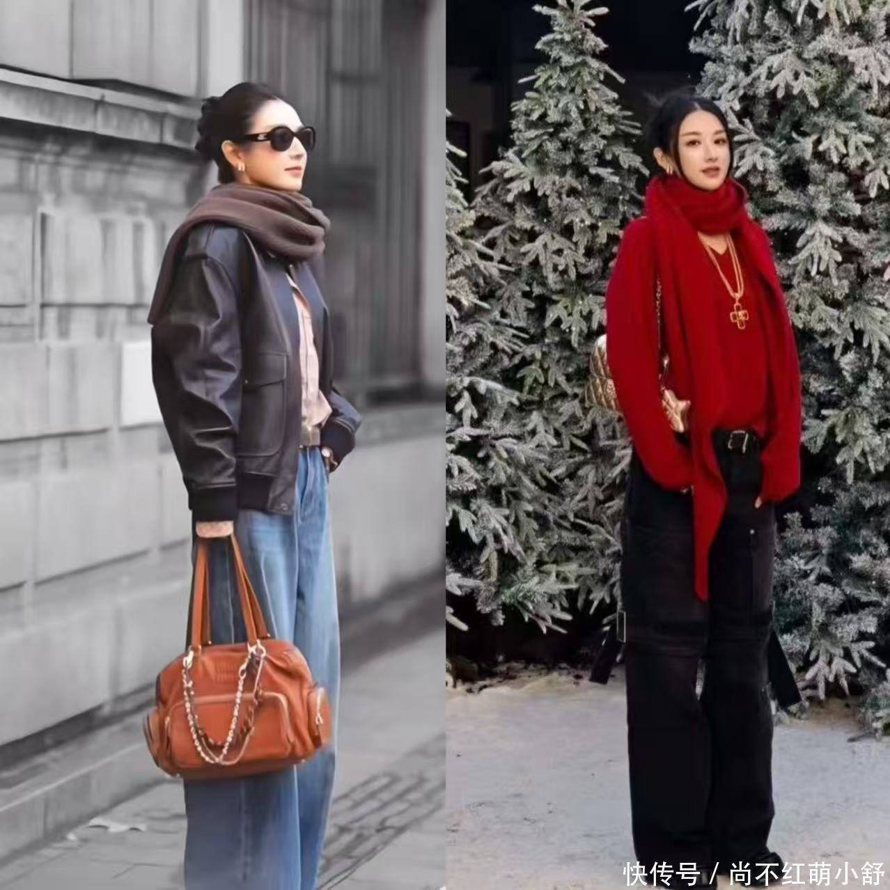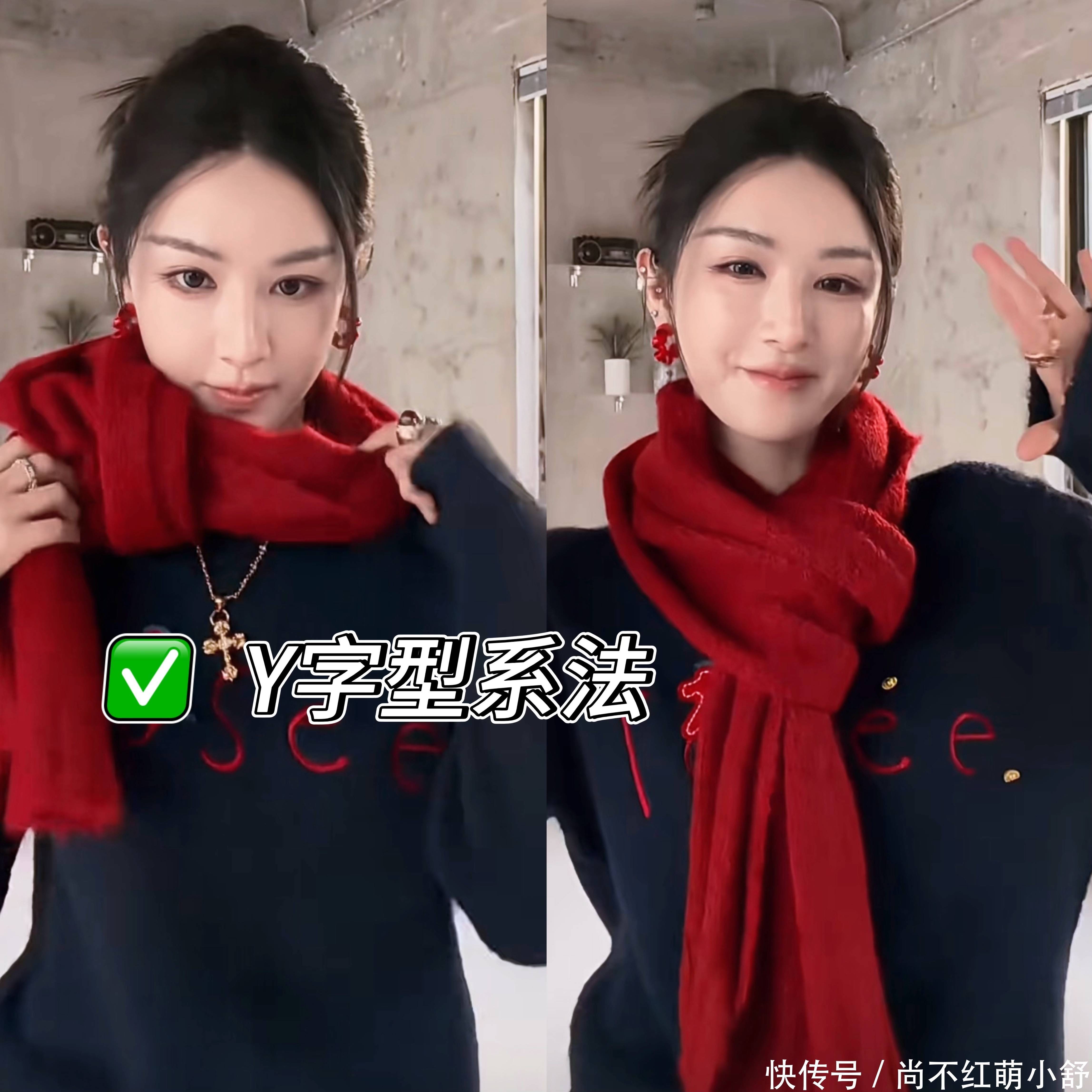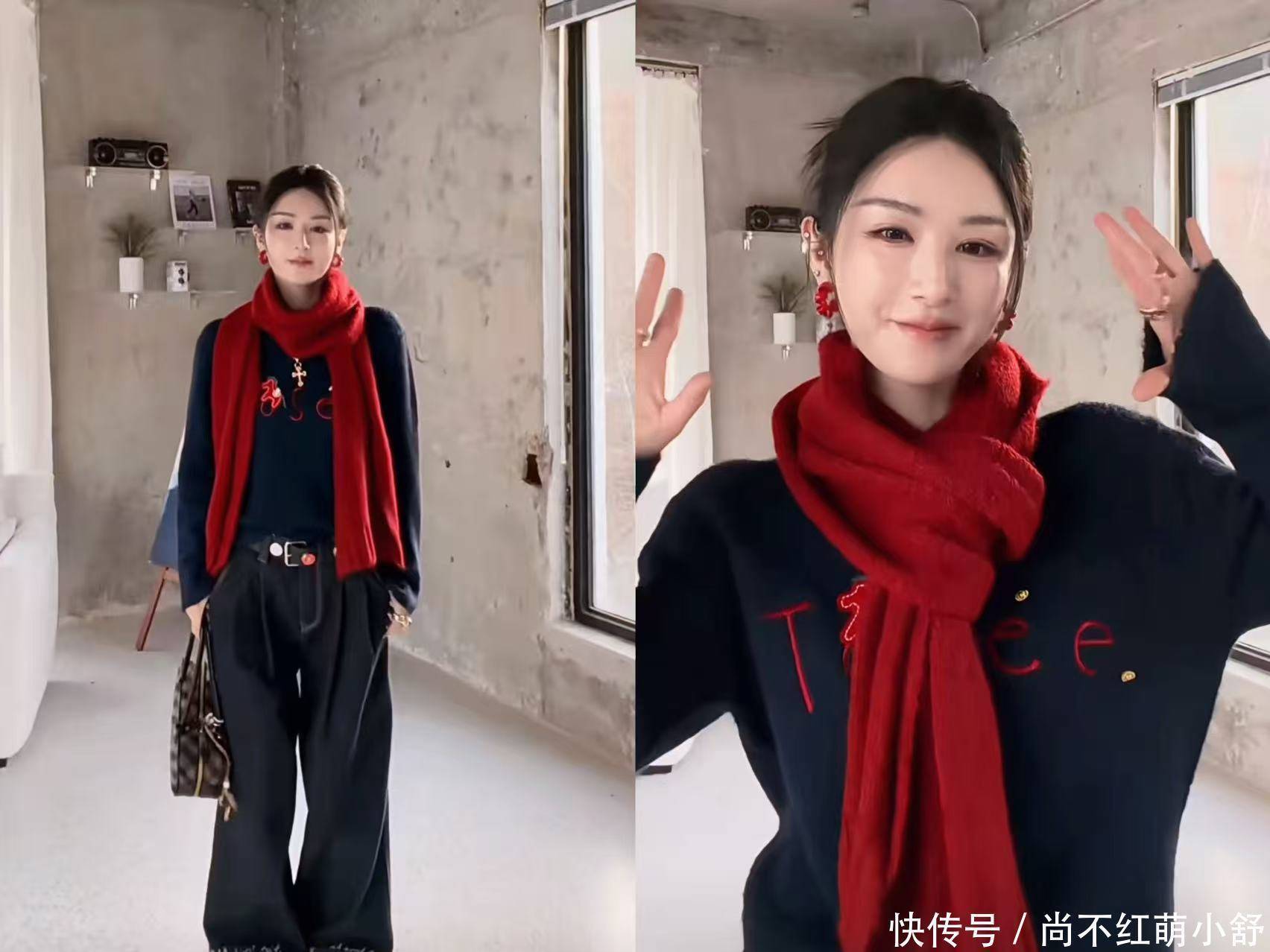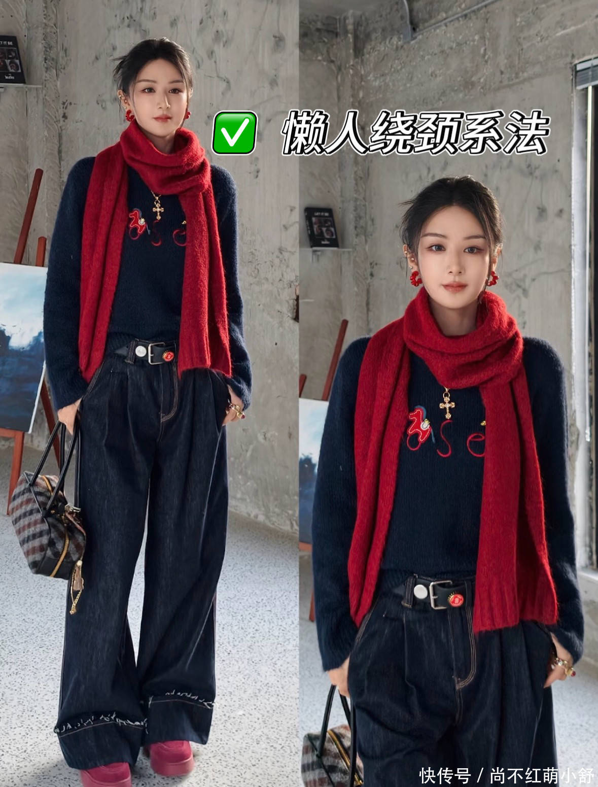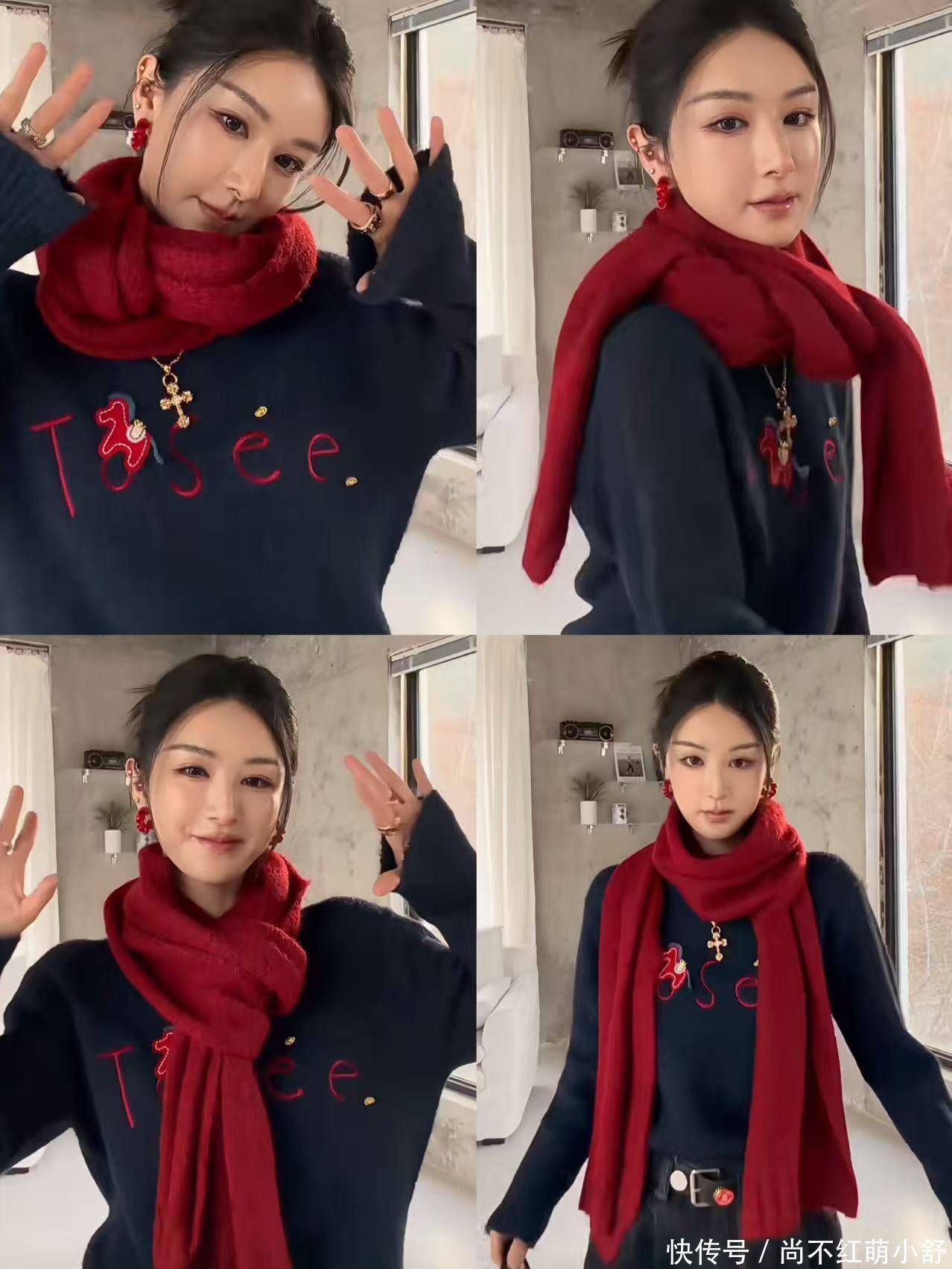 她这款Y字型围巾系法,将围巾绕颈后,把一端斜搭胸前,另一端自然垂落侧边,营造不对称松弛感。不得不说,红围巾配深色毛衣,慵懒随性又显利落,是新年氛围感穿搭的实用技巧。