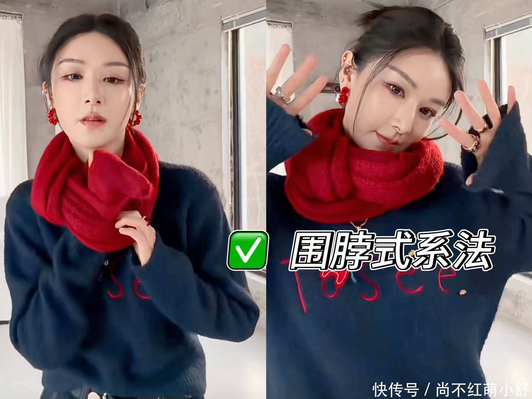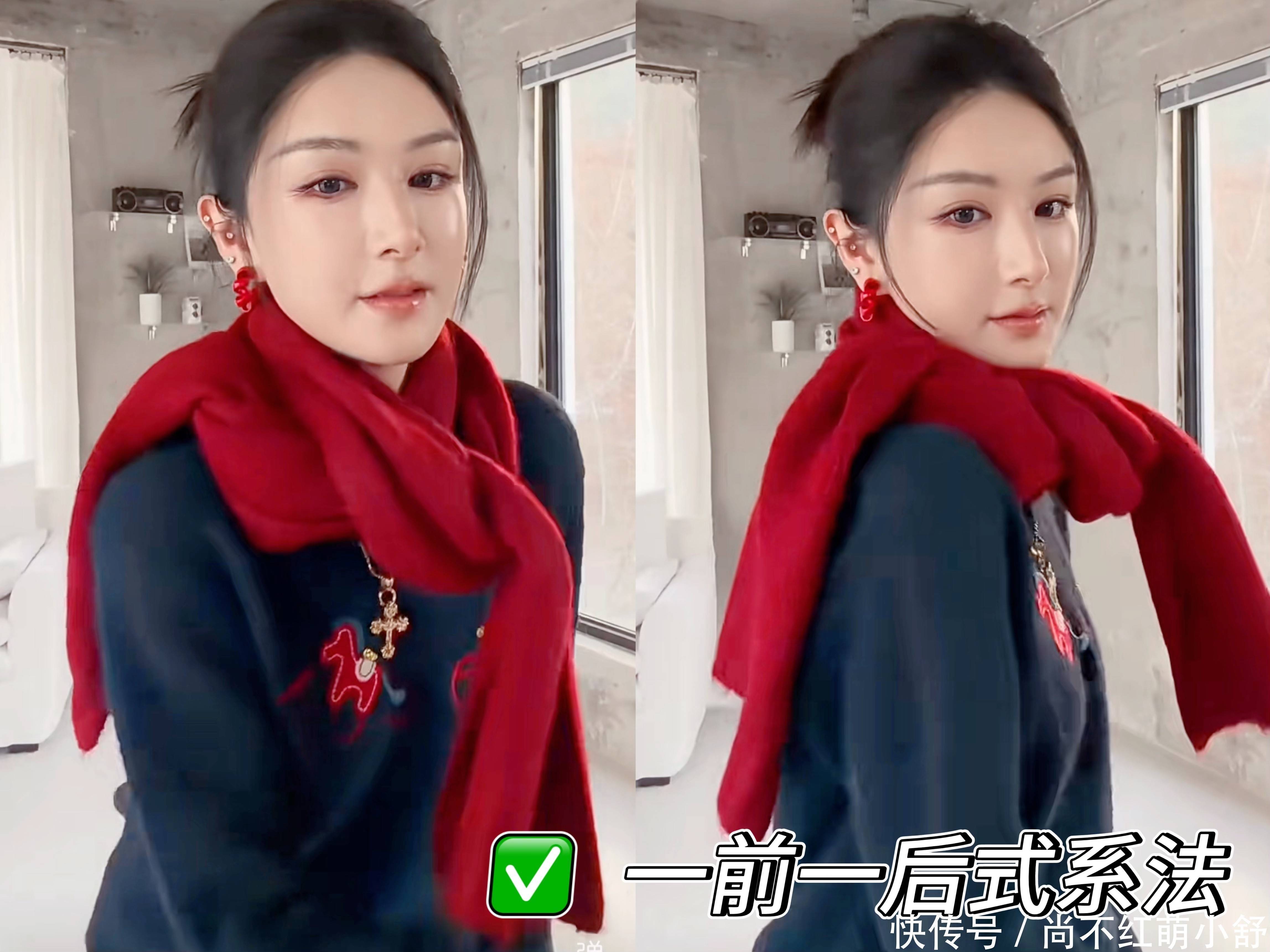 薇娅这款一前一后围巾系法,先将围巾绕颈一圈,一端垂前、一端甩后,调整蓬松度让线条自然松弛,红围巾配黑毛衣,慵懒又有新年氛围感。