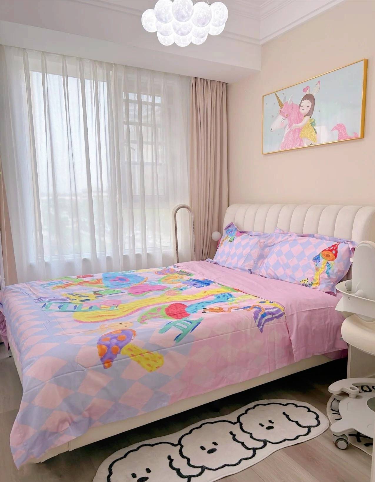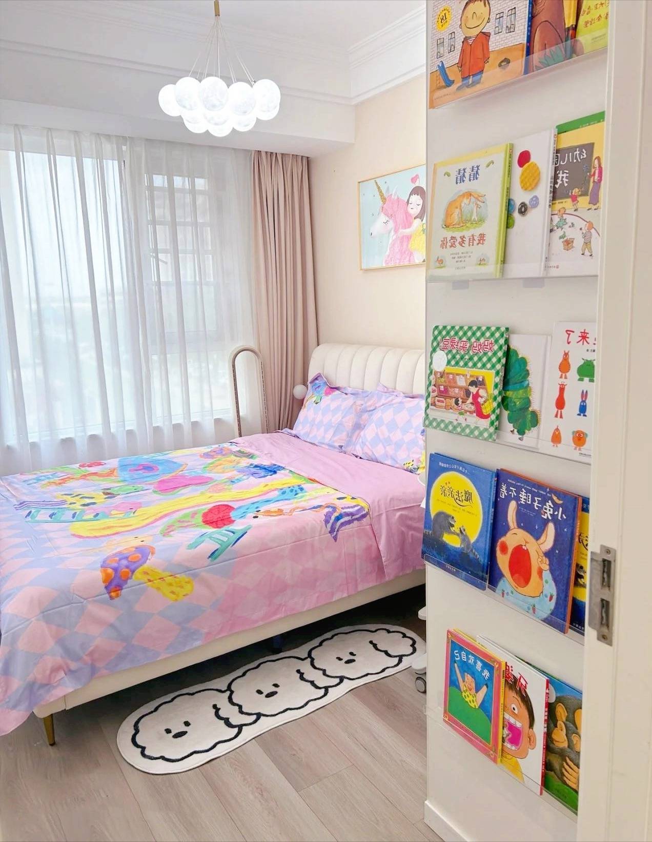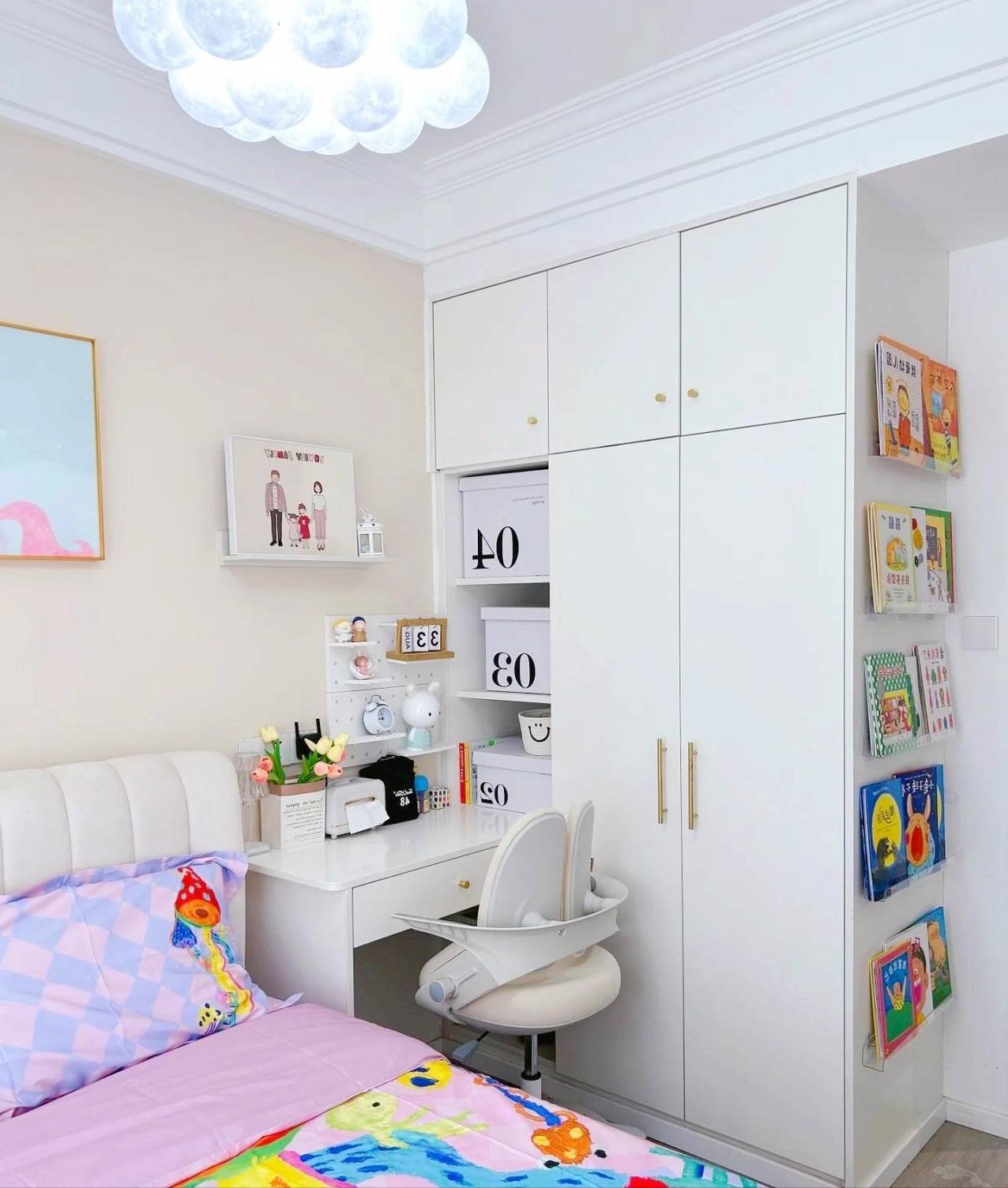 儿童房只有9平米,没有吊顶,只用了石膏线,使得房间显得宽敞。床头背景墙主打奶咖色,温馨耐看,墙上挂了一幅可爱的漫画,床品也是彩色漫画图案,非常适合小朋友。床右侧是定制书桌与衣柜组合一体柜,既满足看书学习和收纳需求,又省空间实用。