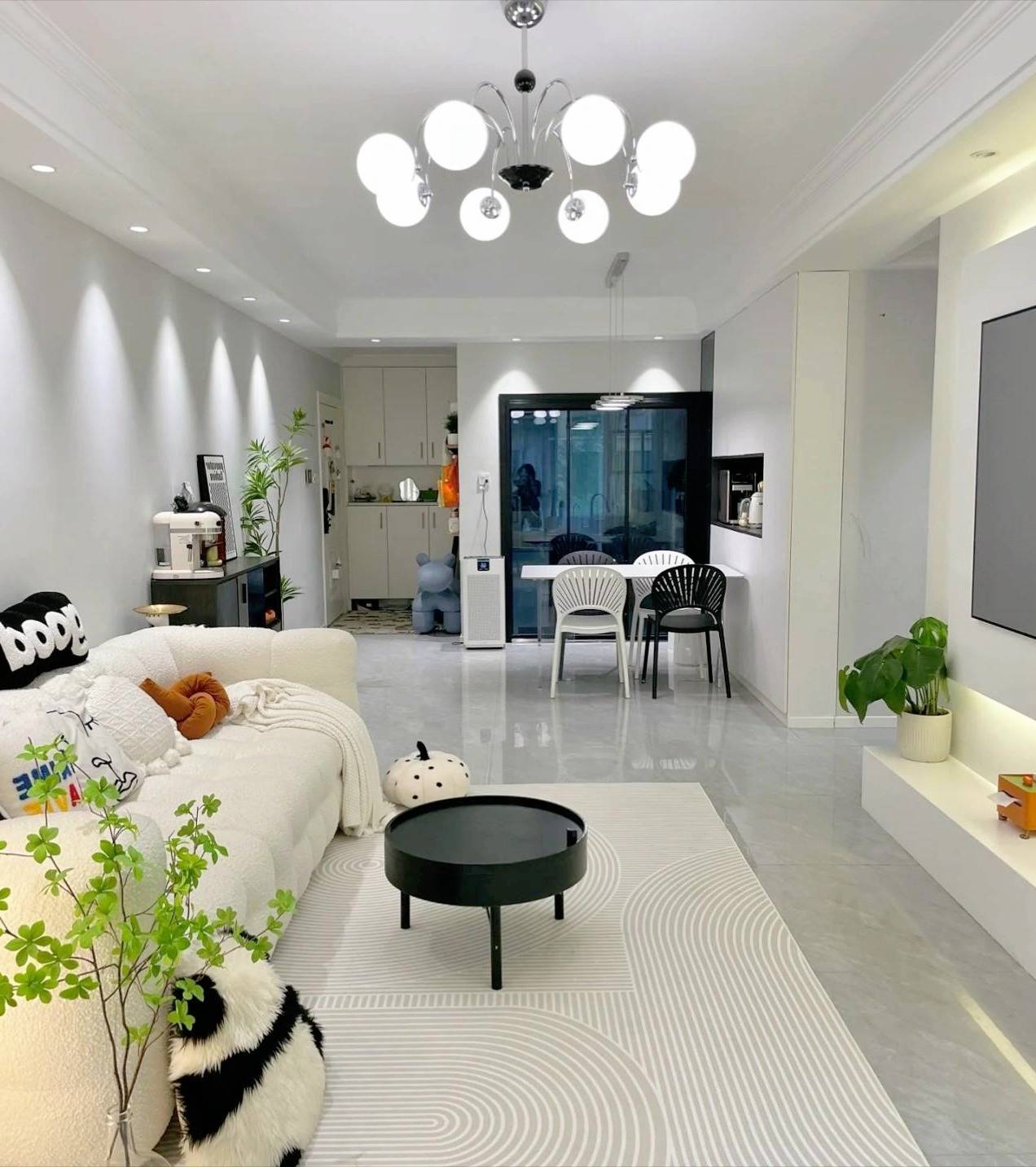 客厅开间3.4米,层高2.7米,仅做了一圈简单的双眼皮吊顶,既不压低层高,又显得空间宽敞、有层次。打通阳台后,采光充足,使用面积增加。硬装和软装以灰色和白色为主,简洁耐看。