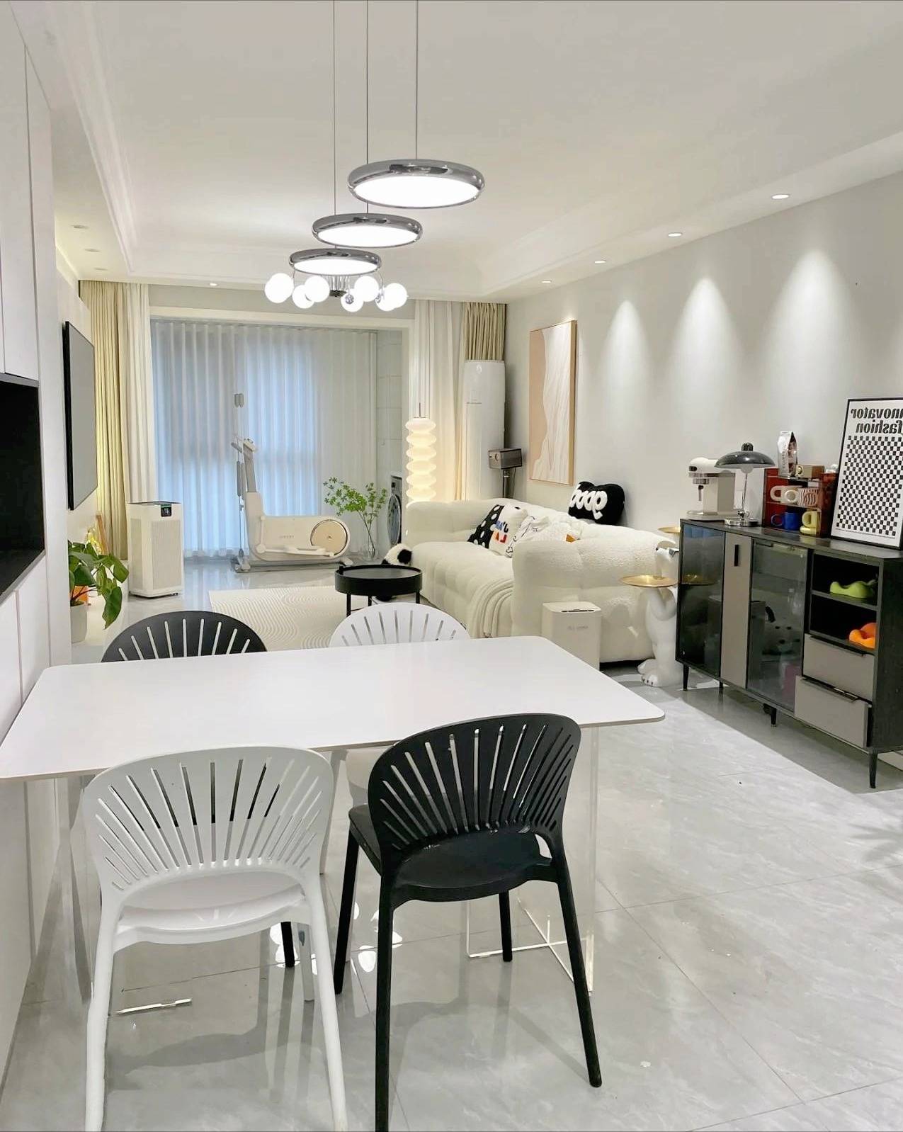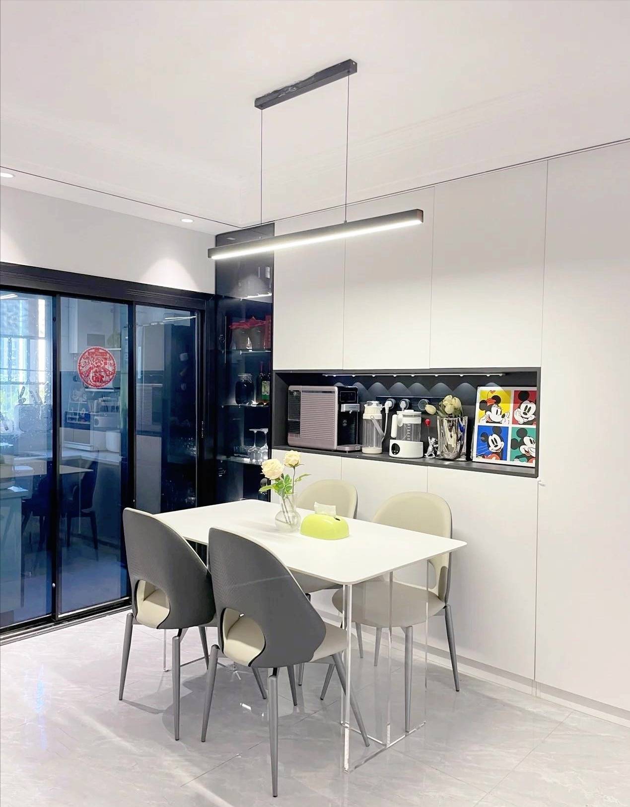 餐厅内,白色岩板餐桌配以黑白贝壳餐椅和一字吊灯,简约而有格调。靠墙的定制餐边柜既省空间又显规整,白色柜门与黑色柜身相配,简洁时尚。柜子中部留空,用于放置饮水机、电饭煲等厨房小电器,方便使用。侧面设有一列玻璃柜,可展示摆件或作为酒柜,装饰效果佳。
