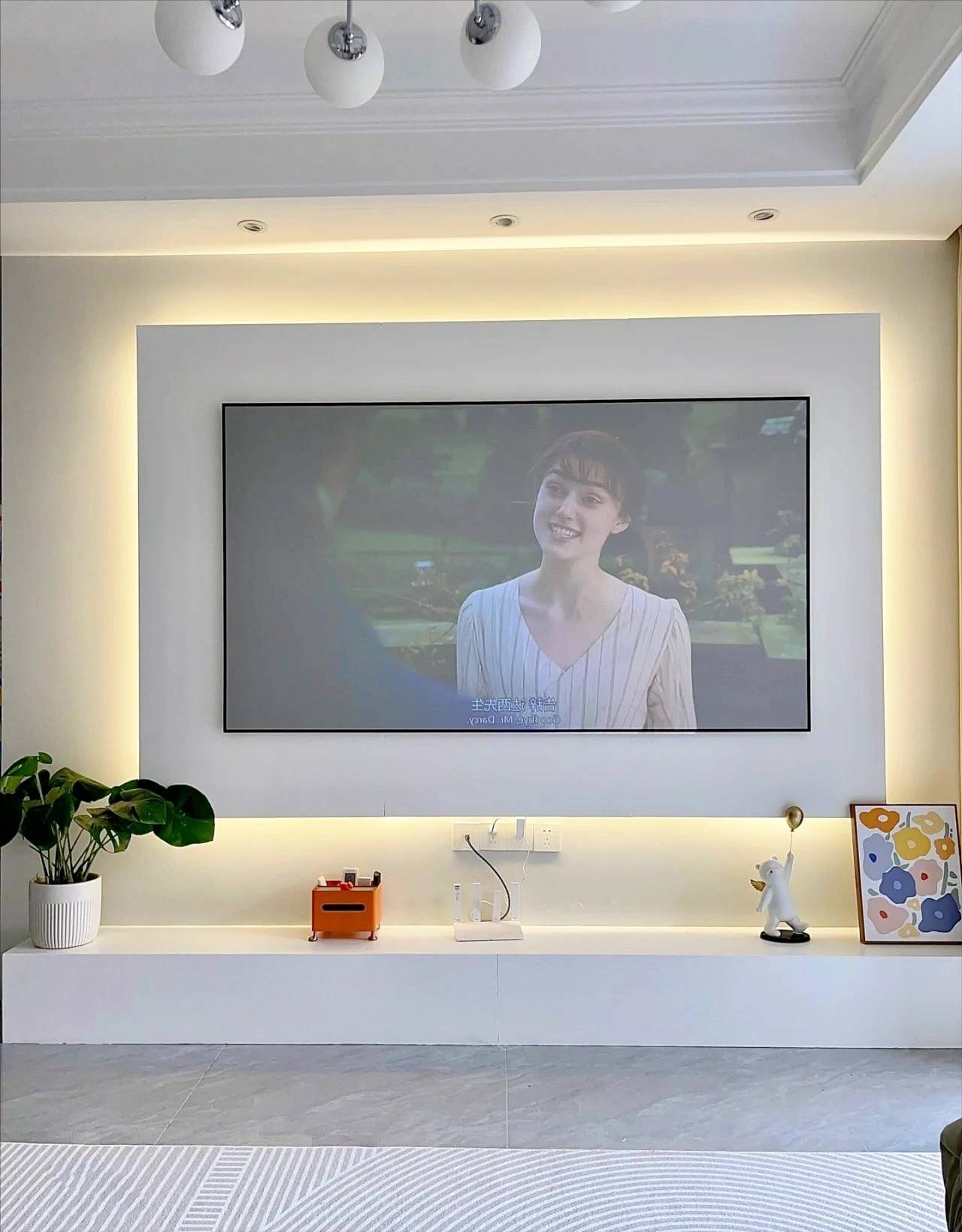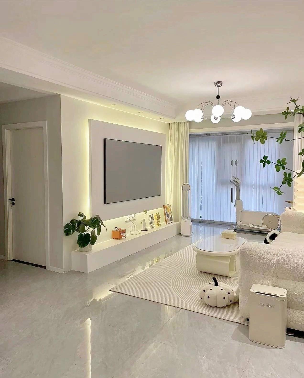 电视背景墙采用浅灰色乳胶漆为基础,搭配白色方形岩板和内嵌灯带,电视柜改用地台设计,与背景墙相得益彰,这个16W装出来的家,单是电视墙就令人赞叹,全屋更无一丝俗气。