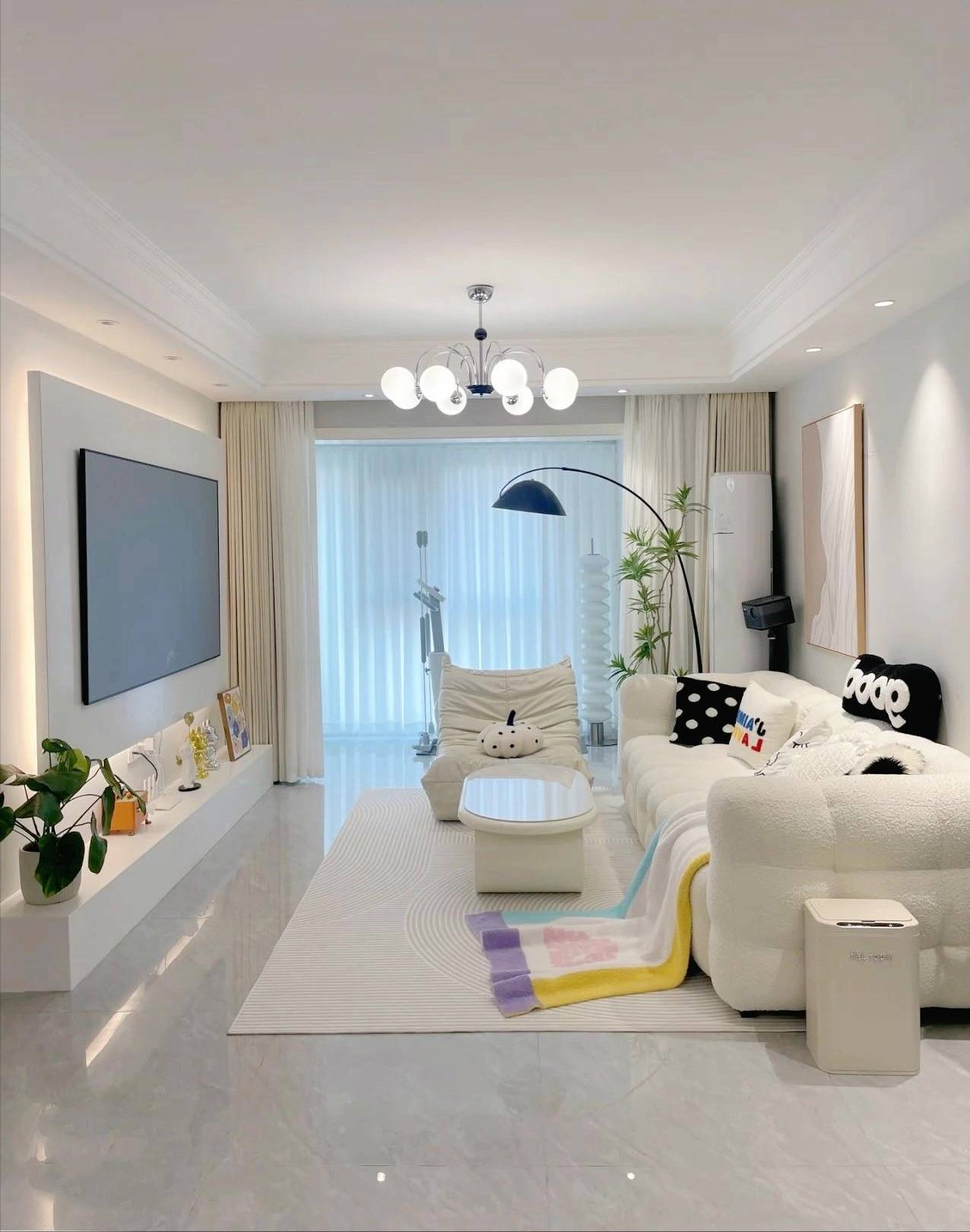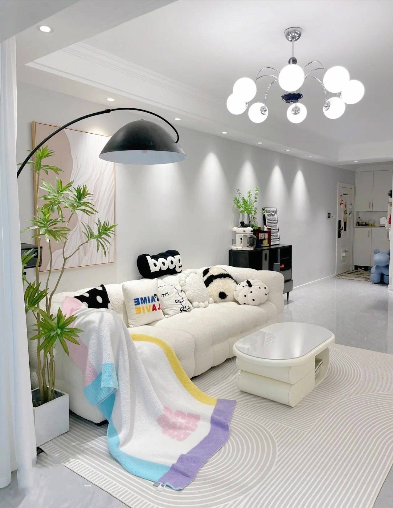 沙发背景墙刷浅灰色乳胶漆,简单大方,搭配装饰画和小山丘灯光,充满艺术感。奶白色云朵沙发温暖舒适,与条纹地毯颜色呼应,为避免大面积白色单调,加入黑色软装点缀,丰富色彩层次,比样板间还漂亮。