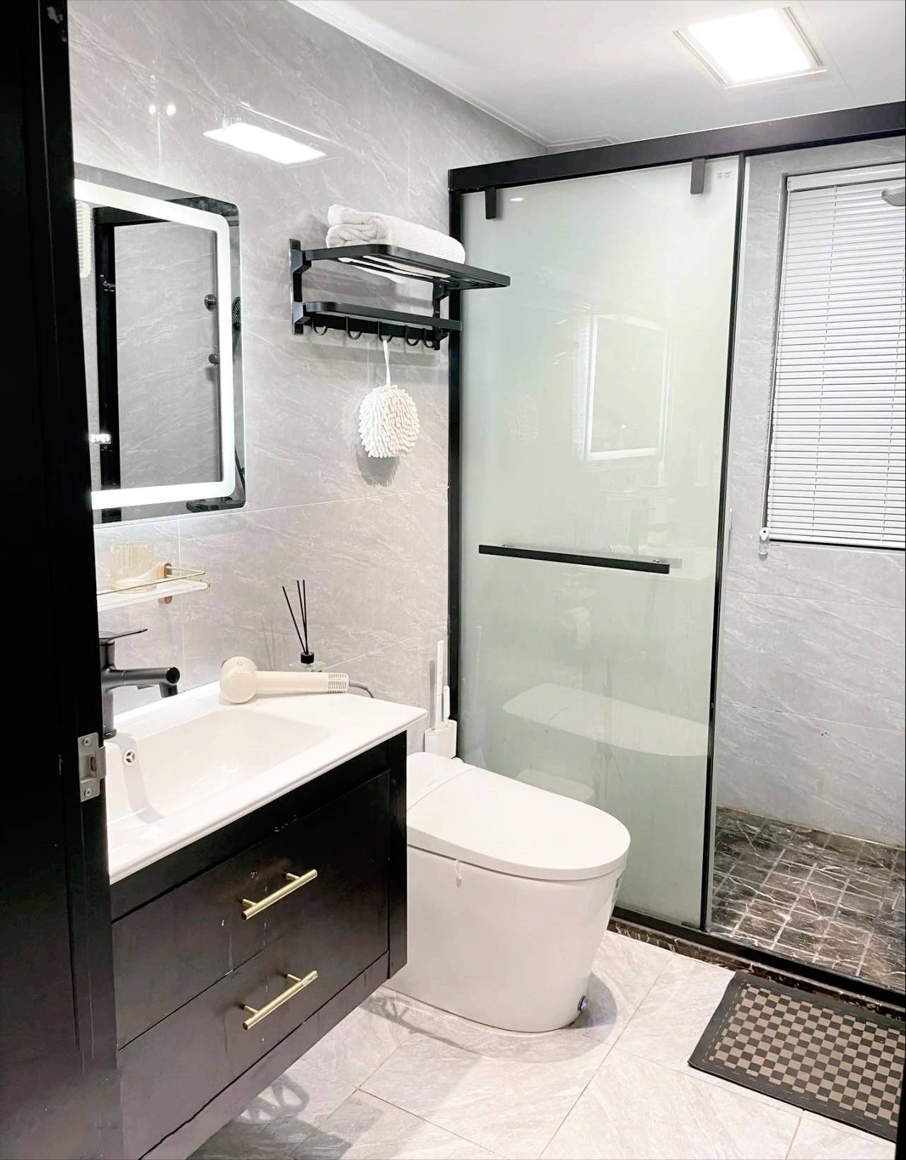 卫生间主要采用黑灰色调178炒股配资论坛网,既大气又耐脏。淋浴区使用推拉玻璃门隔断,通透明亮且节省空间,并有效防止洗澡水外流,实现干湿分离。