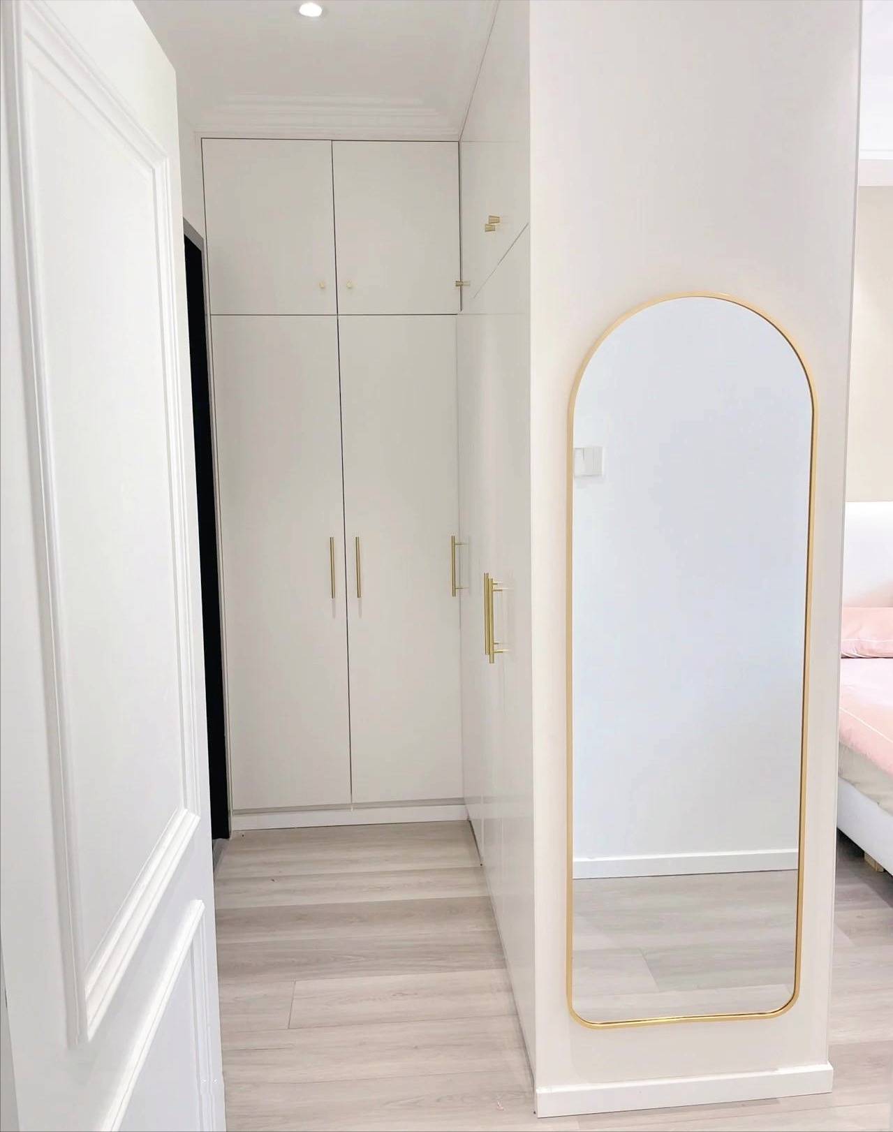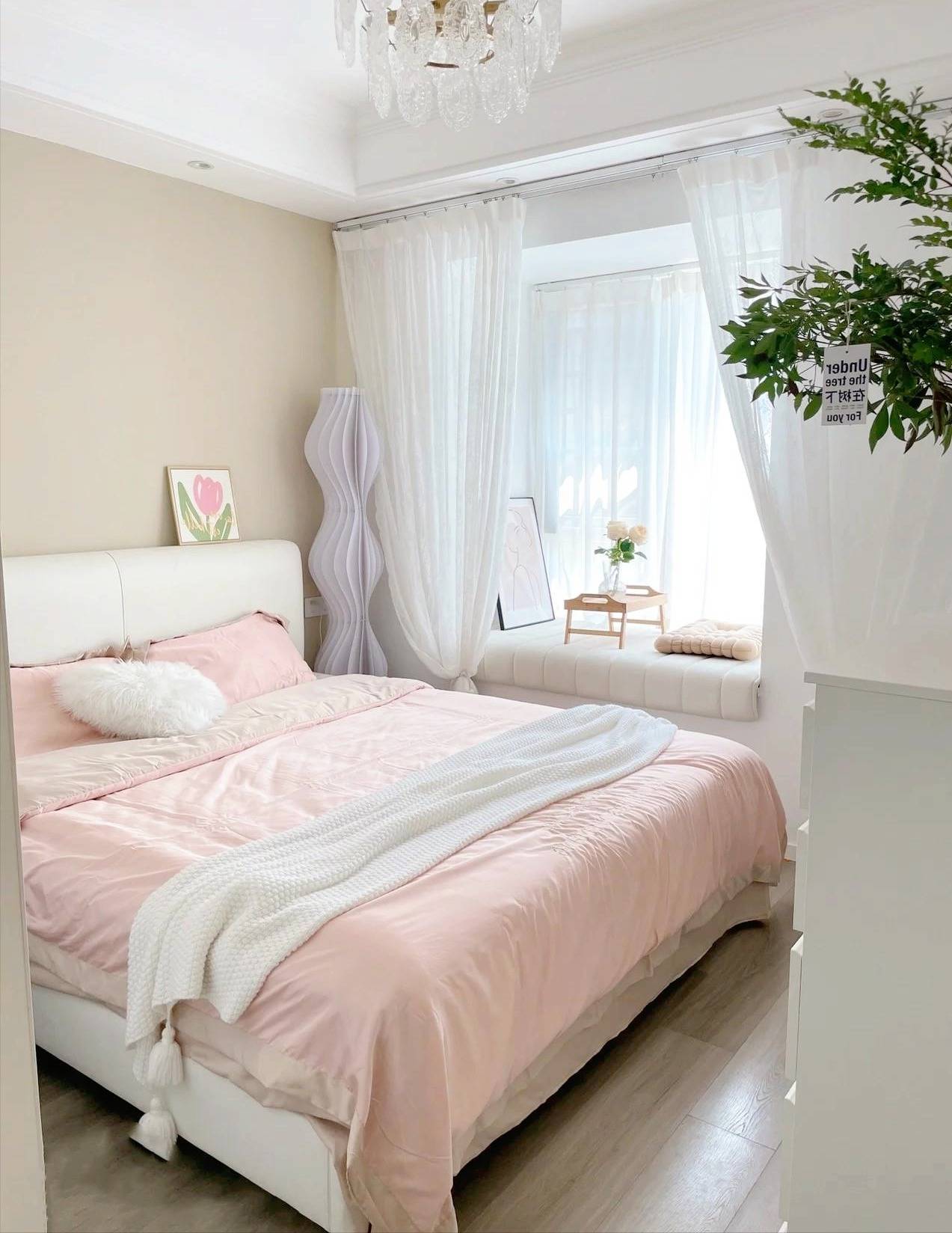 主卧面积12平米,配有卫生间。床头刷奶咖色背景墙,温暖大方;白色床与粉色床品,干净温馨。飘窗改为休闲区,铺上软垫,可看书、晒太阳,十分惬意。为避免卫生间对床不雅,在墙背后设L型衣帽间,收纳空间充足。