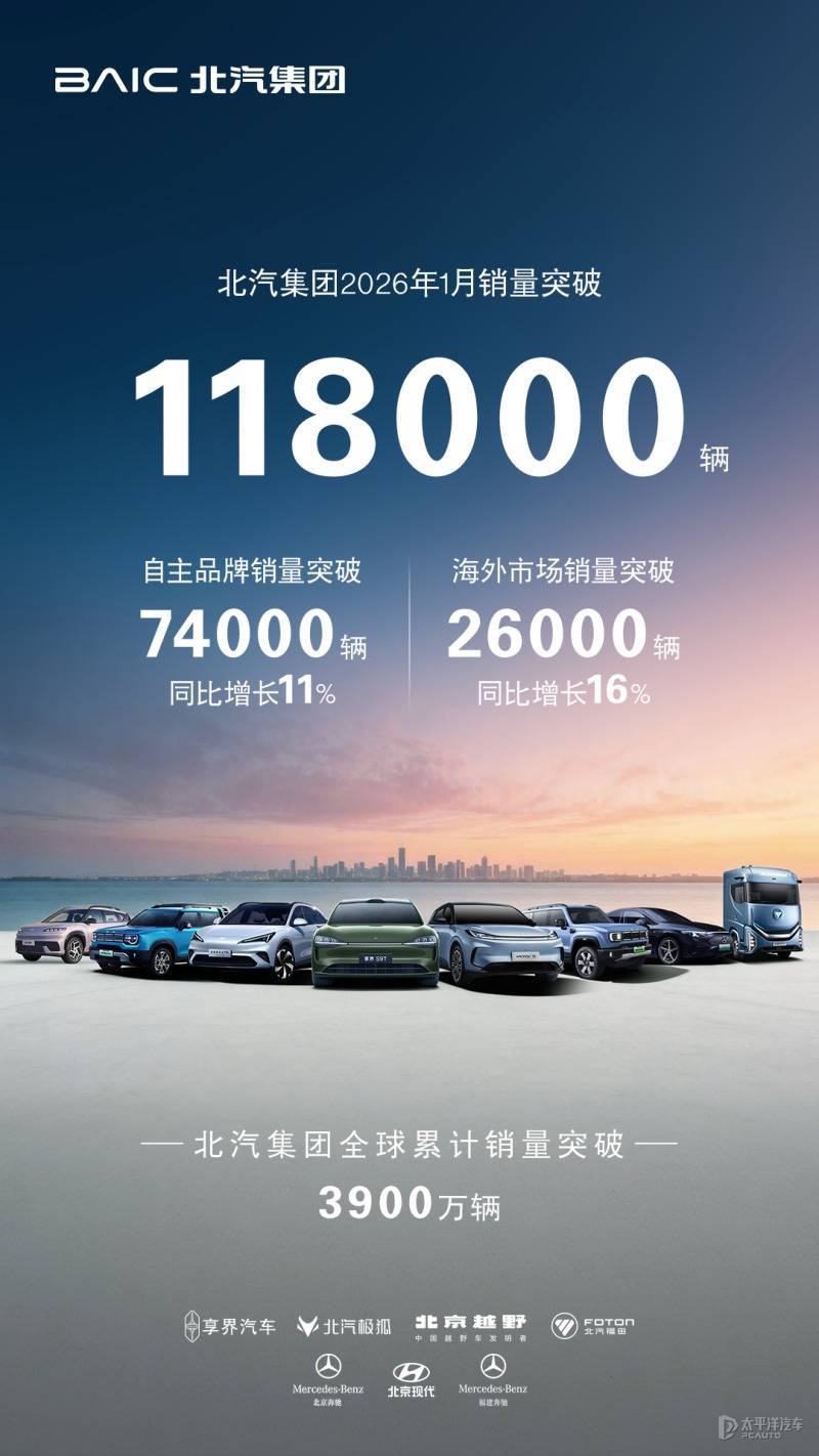 北汽集团1月销量超118,000辆新车,其中自主品牌销量突破74,000辆,同比增长 11%,海外市场销量突破26,000辆,同比增长16%。目前,北汽集团在全球范围内的累计销量已超3900万辆。