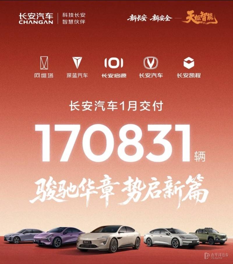 长安汽车1月交付170,831辆新车,不过旗下品牌具体销量并未公布,不过可以知道的是深蓝S05上市以来累计销量超17万辆,月均销量过万;长安启源A06上市累计交付超2.1万辆;长安CS75系列累计销量超300万辆;长安逸动连续11个月销量过万。