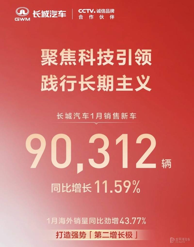 长城汽车1月销售新车90,312辆,同比增长11.59%。其中,1月海外销量同比增长43.77%。具体到品牌方面,哈弗品牌1月销售50,513辆,同比增长4.03%;魏牌1月销售7,873辆,同比增长57.24%;坦克品牌1月销售14,505辆,同比增长12.92%;欧拉品牌1月销售2,057辆,历史累计销量达55.98万辆;1月长城皮卡销售15,350辆,同比增长24.58%,连续28年位列中国皮卡销量第一。对于2026年,魏牌将发布旗舰产品——魏牌V9X,定位大型SUV,搭载2.0T插混系统,CLTC纯电续航超400km,竞争问界M9和极氪9X。