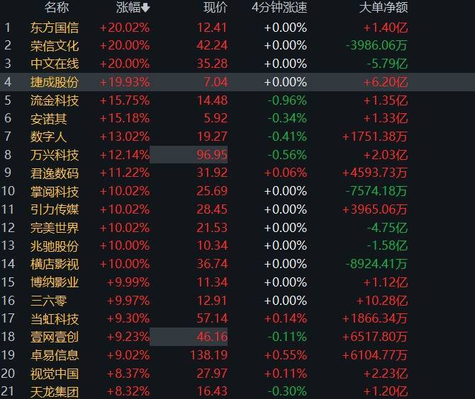 【大河财立方消息】2月9日午后,AI应用端涨势扩大。截至发稿炒股配资代理,东方国信、荣信文化、中文在线、捷成股份20CM涨停,掌阅科技、引力传媒、三六零等同步涨停,流金科技、万兴科技、海天瑞声、当虹科技等跟涨。